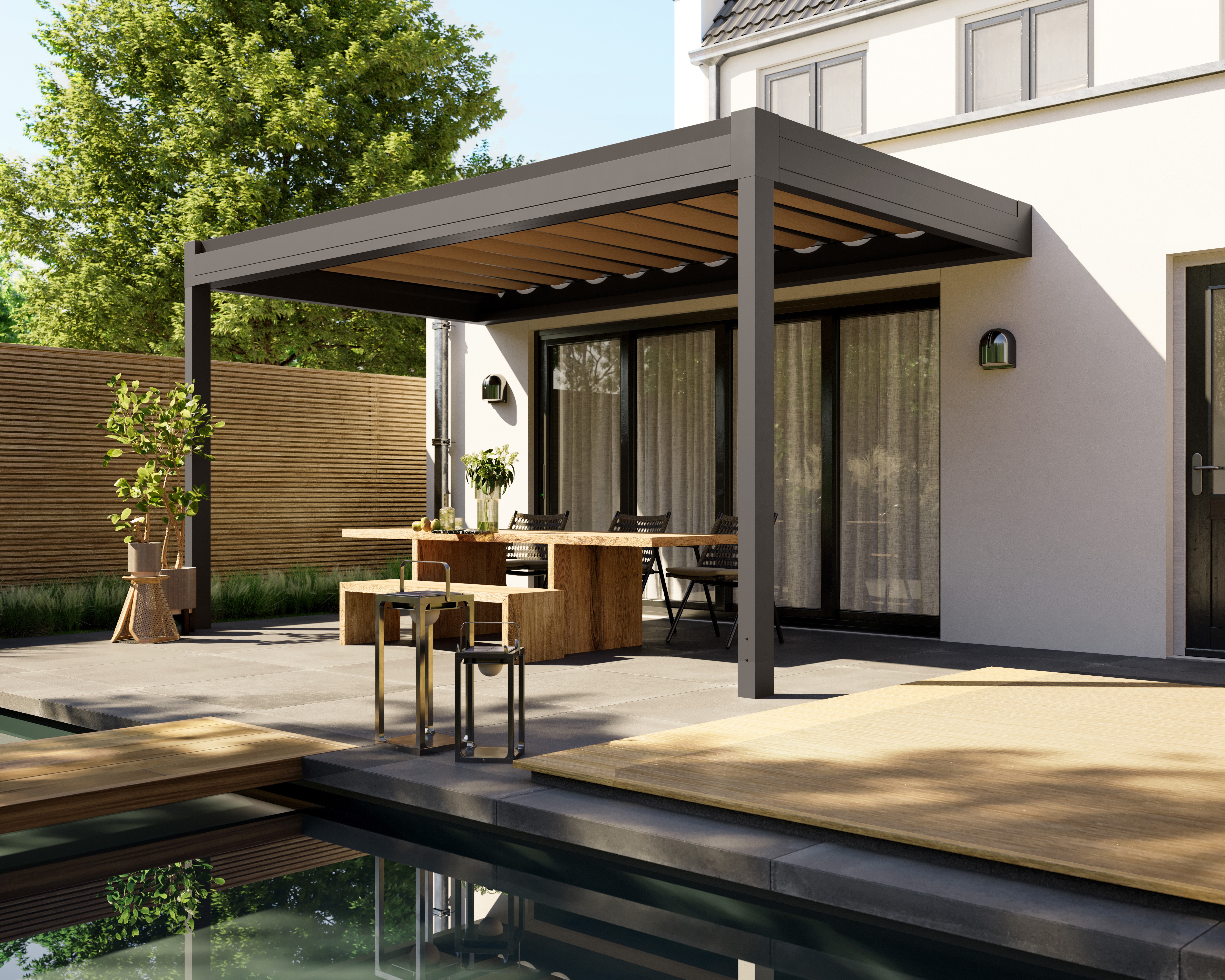 • Pergola met een opvallend gevouwen doek voor een modern uiterlijk