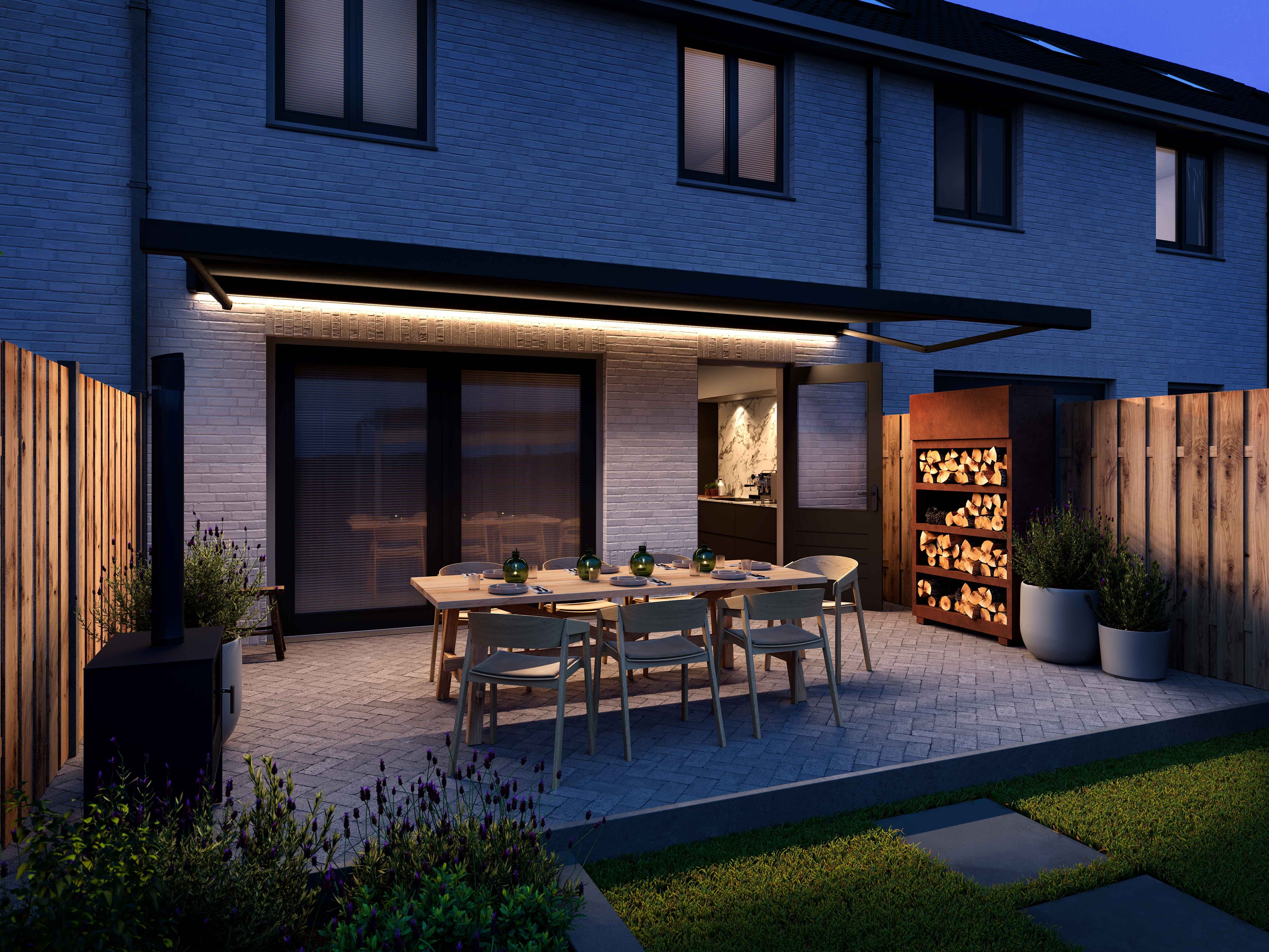 De Alora combineert modern design met veelzijdigheid en biedt een elegante, kubistische uitstraling die perfect past bij elk type woning. Het compacte, vierkante ontwerp zorgt ervoor dat het scherm in gesloten stand strak tegen de gevel hangt.