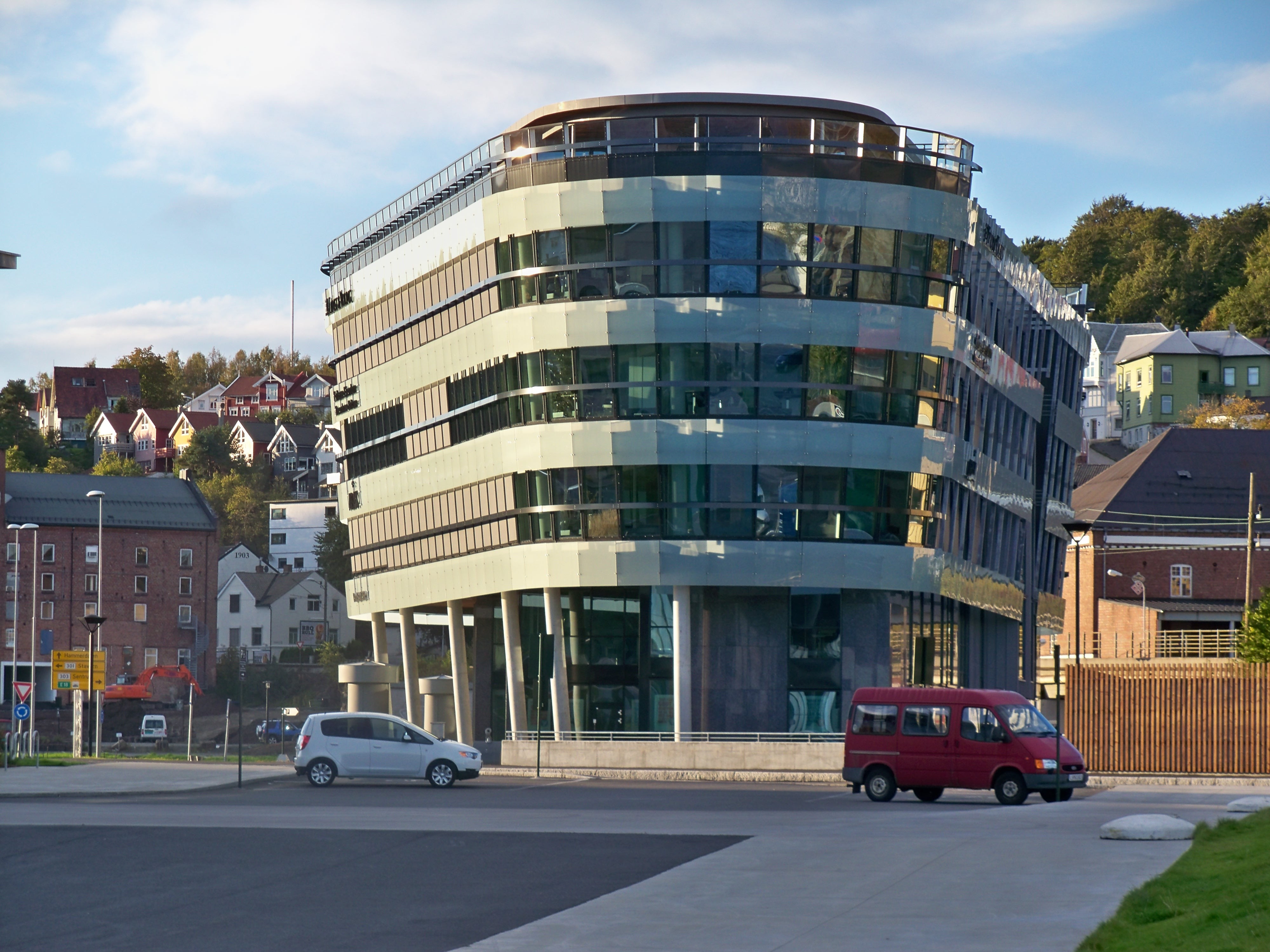Am Hafen von Larvik entsteht im Rahmen der Modernisierung des Hafengebiets das Neubauprojekt „Sanden”, das einen großen Kontrast zu der traditionellen norwegischen Architektur bildet. Beim Entwurf des Bürogebäudes hat sich der Architekt von der berühmten Aalto-Vase des finnischen Designers Alvar Aalto inspirieren lassen.